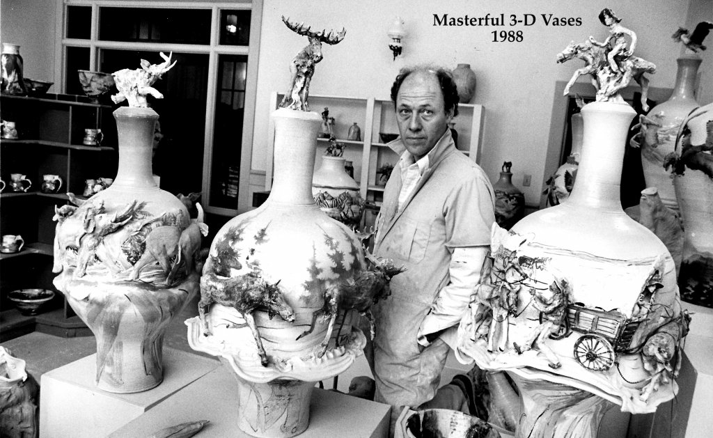 Pictured with Sue, in front of the newly installed display unit with a digital screen featuring a selection of his many commissioned works, are members of the IGEF board. Front row: Judy Belken, Sue Howdle, Peggy Biddick, Rachel Zimmer, Ron Haas, Kristin Spurley. Back row: Vicki Langfoss, Fred Skaife, and Dave Kalish.